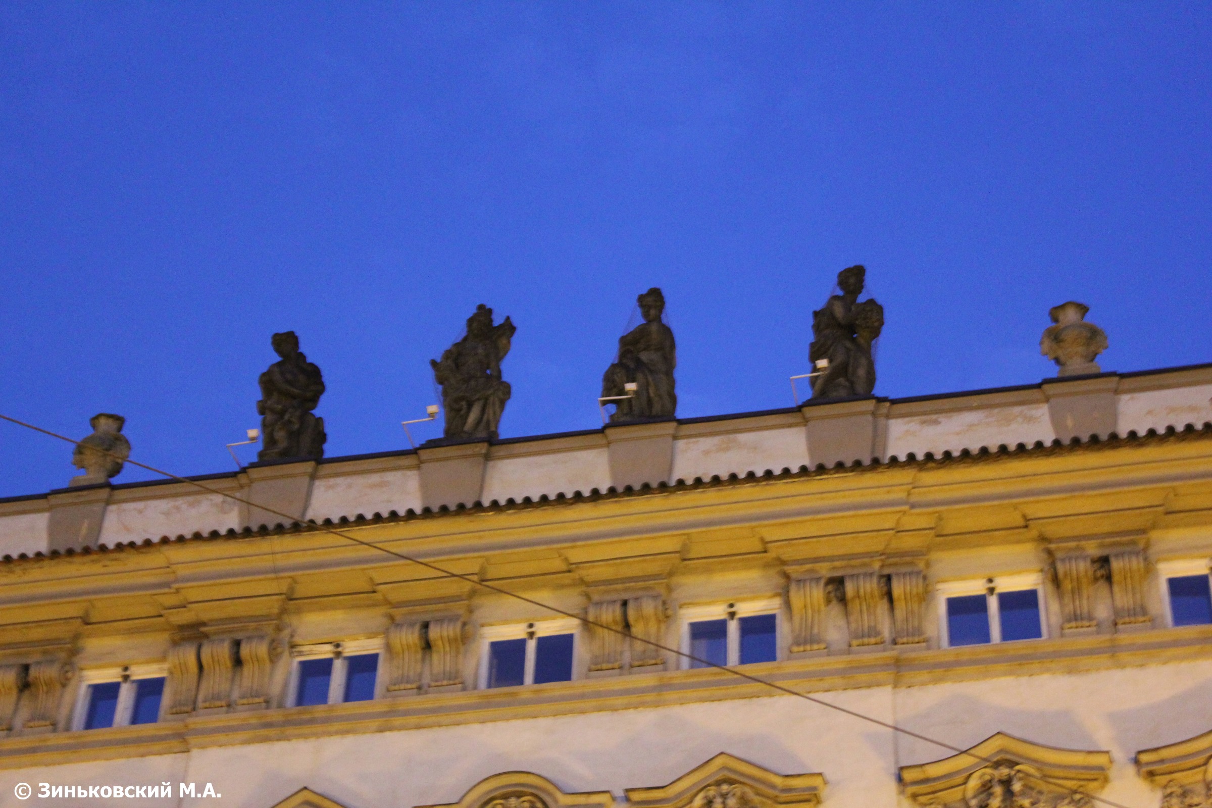 В 1700 году в результате совмещения двух домов благодаря архитекторам Аллипранди и К.Динтценгофери ренессансного типа появился Кайзерштейнский дворец для главнокомандующего пражской Армией Гельфрида Кайзерштейна. Скульптур О.Мост на аттике фасада изобразил 4 статуи-аллегории – символы времен года. В 40-х годах XIX века перешел в собственность Чешской сберкассы, которой принадлежит до сих пор.