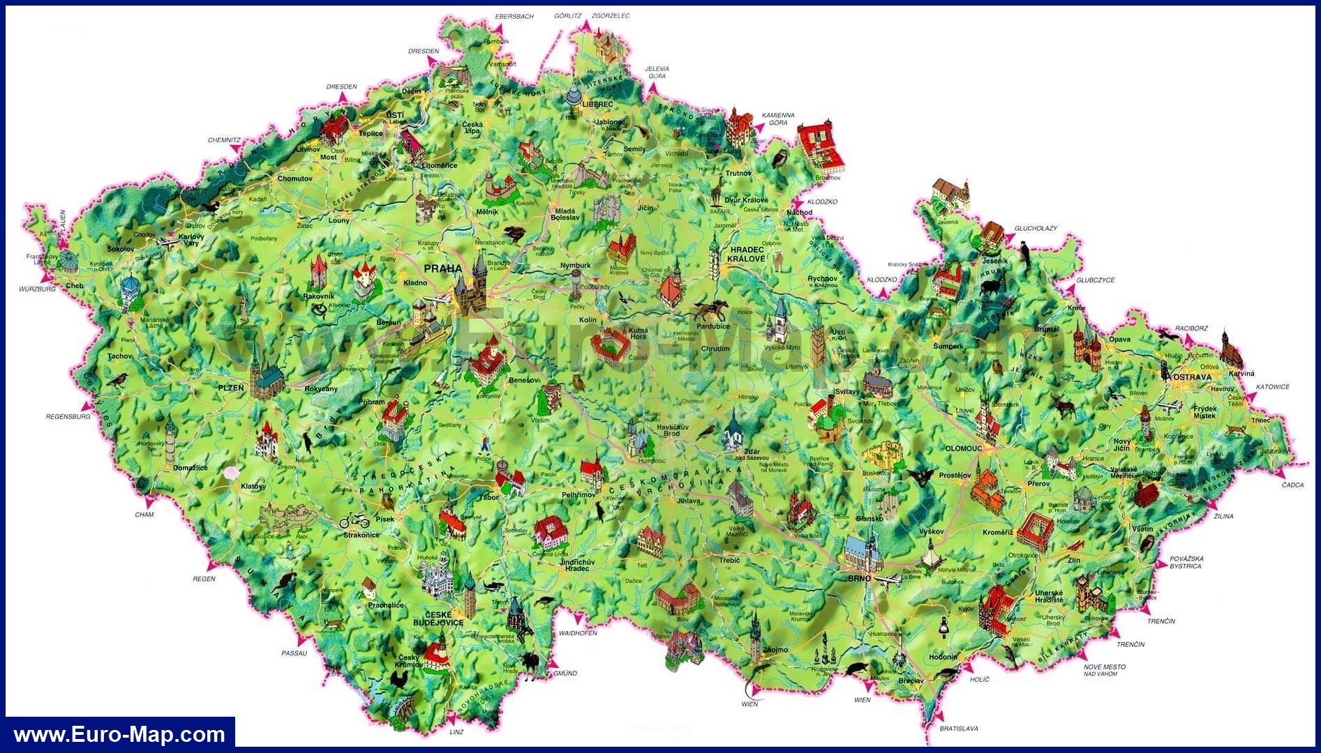 Туристическая карта Чехии с достопримечательностями и курортами